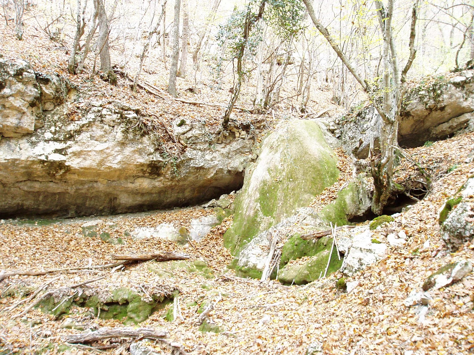 Идём вверх по сухому руслу в овраге Мунде-Дере. Местами, конечно, приходится продираться через негустой подлесок, но не часто. По пути встречаются вот такие живописные скальные стеночки.